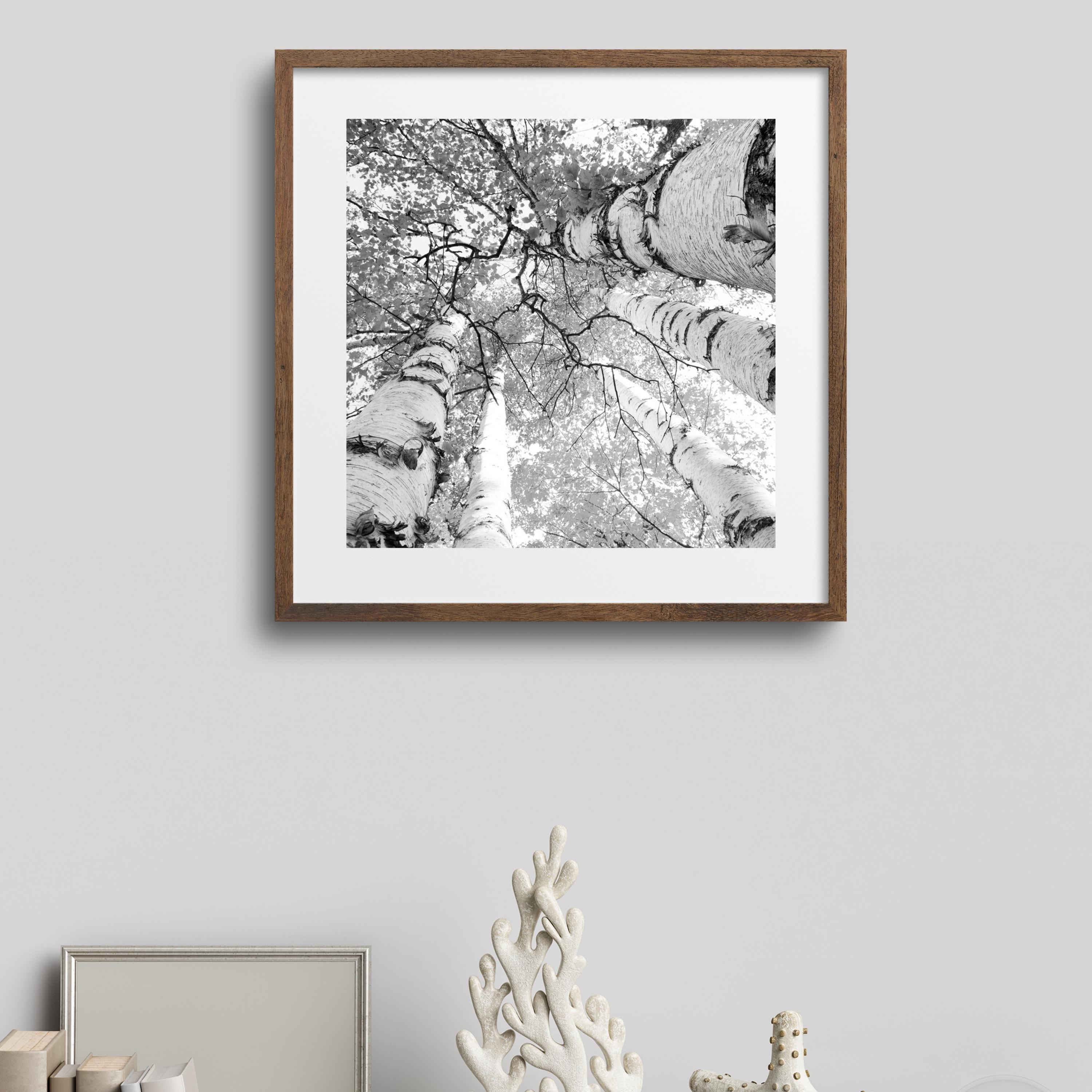 Title: Birch Tree Canopy. Black and white picture of birch trees growing close together, with their trunks guiding the eye toward their canopies and the sky above them. Popular birch tree wall art choice in my shop. Available on paper (unframed and framed), canvas, and framed canvas. Select from a variety of sizes - from 5x7 to 40x60 inches. Feel free to send me a message if you need a custom size or if you have any other questions; I respond quickly.